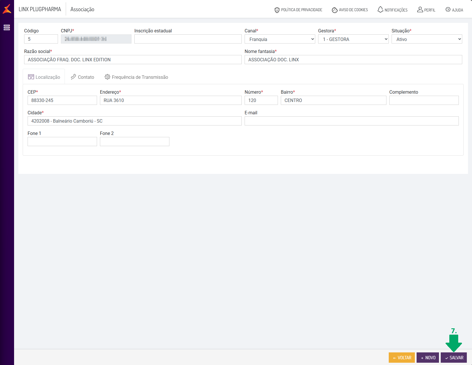 Importante: ao editar o cadastro de associação, não será possível editar o campo 'CNPJ', caso o cadastro esteja incorreto. Recomendamos alterar o campo 'Situação' para 'Inativo' e no rodapé, clique 'Novo' para adicionar a associação com o CNPJ correto.