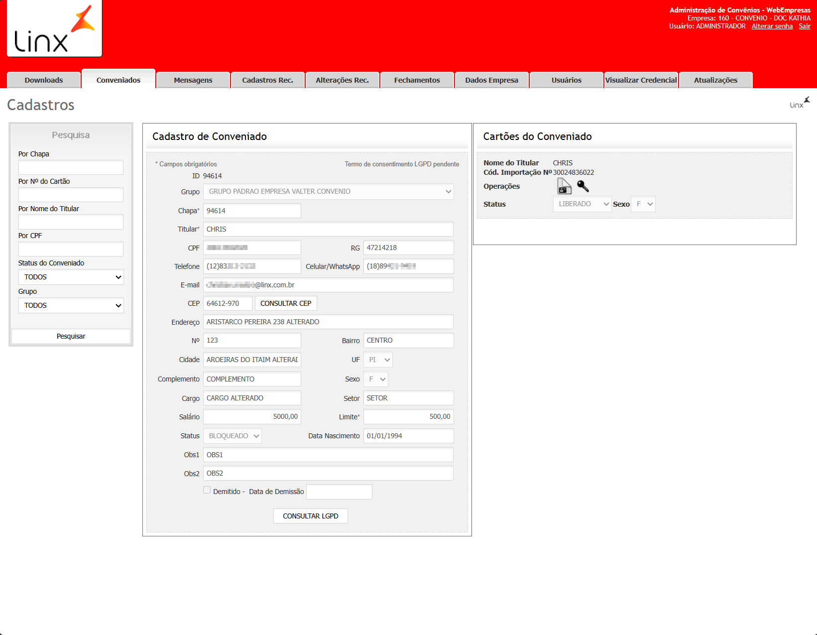 Atenção: quando no Linx Conecta ADM em 'Configurações' > 'Configurações do Sistema' > aba 'WebEmpresas' estiver configurado como 'Não' os campos 'Permitir manutenção no cadastro dos conveniado' e 'Permitir alteração somente do bloqueio e da demissão do conveniado' ao acessar o Web Empresas 'Cadastro de conveniados' os campos vão estar desabilitados para realizar cadastros e edição. Para mais informações sobre estas configurações do Linx Conecta ADM, verifique o artigo: Linx Conecta - Configuração do Sistema - Como realizar as configurações do sistema Web Empresas.