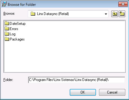 5. No campo Folder, indique o diretório em que será realizada a instalação. Por padrão, será sugerido o diretório "C:\Arquivos de Programas\Linx Sistemas\Linx Datasync (Retail).