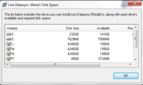 • Disk Cost - O botão Disk Cost pode ser utilizado para verificar o espaço em disco das unidades. Para o Linx Datsync Retail, é necessário, aproximadamente, 30 MB de espaço disponível em disco. Ao clicar no botão, será apresentada a tela a seguir: