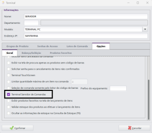 • Modulos → Comandas  → Terminais → ao selecionar o terminal da maquina servidor comandas
