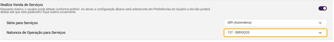 - Venda de serviço no Venda Fácil acesse: Faturamento > Venda Fácil > Menu Lateral > Configurações > Preferência de Usuário ou de Loja. A opção Realiza Venda de Serviços deve estar marcada, bem como a série, e a natureza de operação.