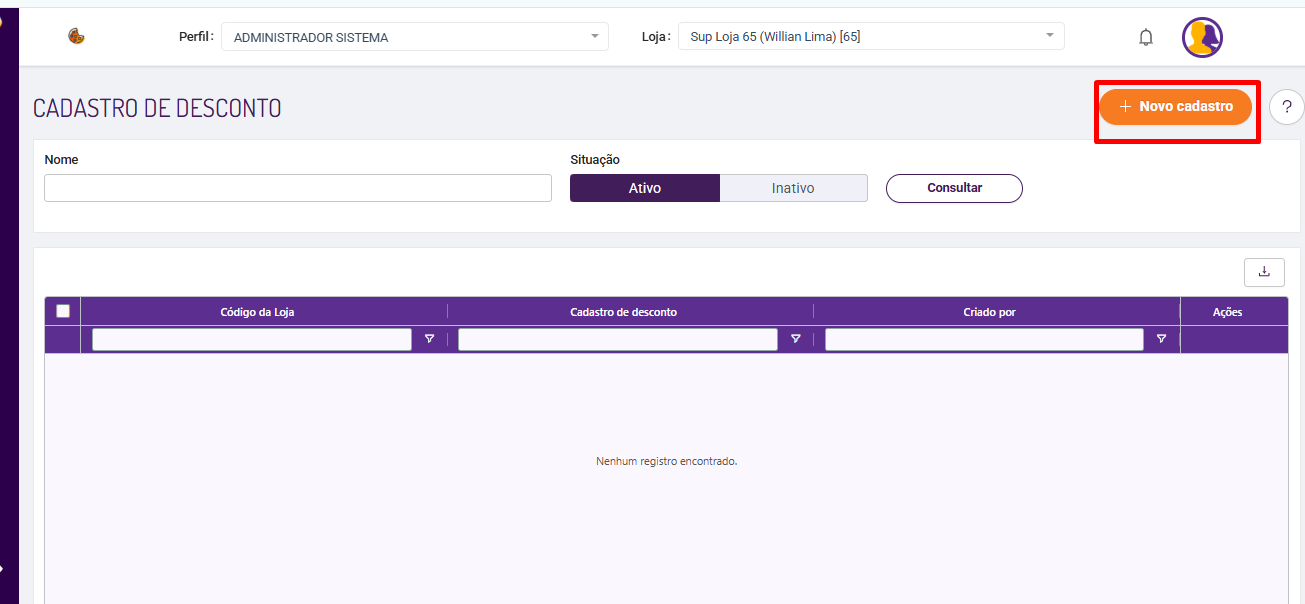 Módulo Cadastro de Descontos habilitado