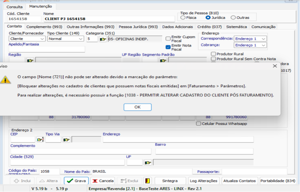 Ao tentar realizar a alteração do nome do cliente, a mensagem de bloqueio abaixo será apresentada.