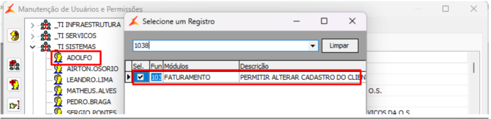 4 - Designar a função 1038 para os usuários.