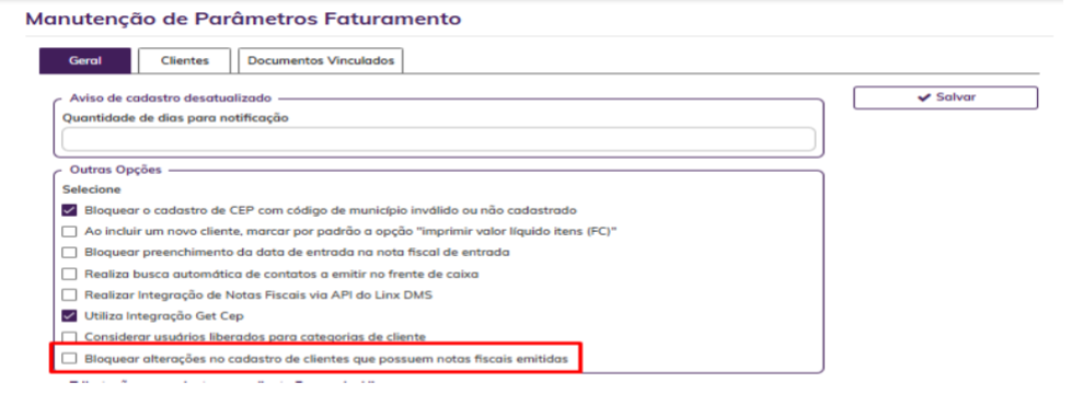 Acessar o menu: Faturamento > Parâmetros e localizar a seção "Outras Opções". Verificar existência da flag "Bloquear alterações no cadastro de clientes que possuem notas fiscais emitidas". Após marcado o parâmetro, todo cliente que possua notas fiscais emitidas, ao tentar alterar as informações do seu cadastro, será bloqueado. Esse bloqueio está vigente para os seguintes campos do cadastro do cliente.