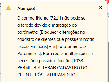 Ao utilizar o parâmetro "Bloquear alterações no cadastro de clientes que possuem notas fiscais emitidas", os campos já mencionados no programa serão bloqueados e não permitirão alterações. Você pode conceder a função 1038 para algum usuário chave, que sempre poderá fazer as alterações, mesmo com o parâmetro marcado.