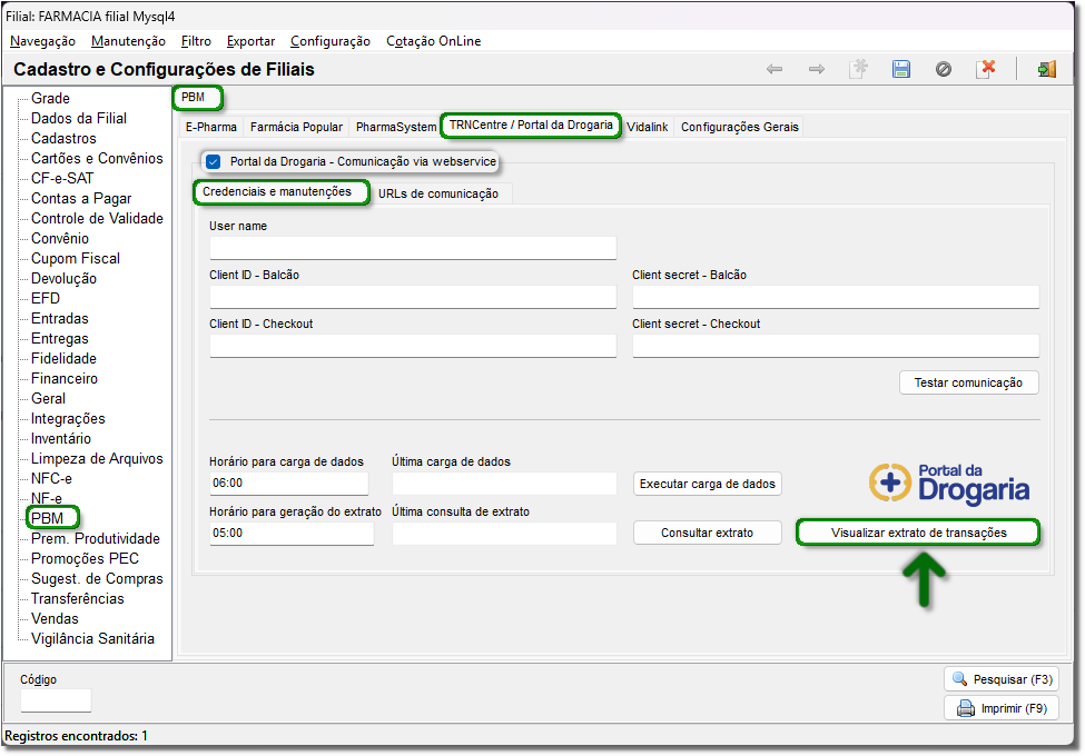 1. No Retaguarda, acesse o menu Configurações > Filiais > PBM > TRNCentre / Portal da Drogaria;
