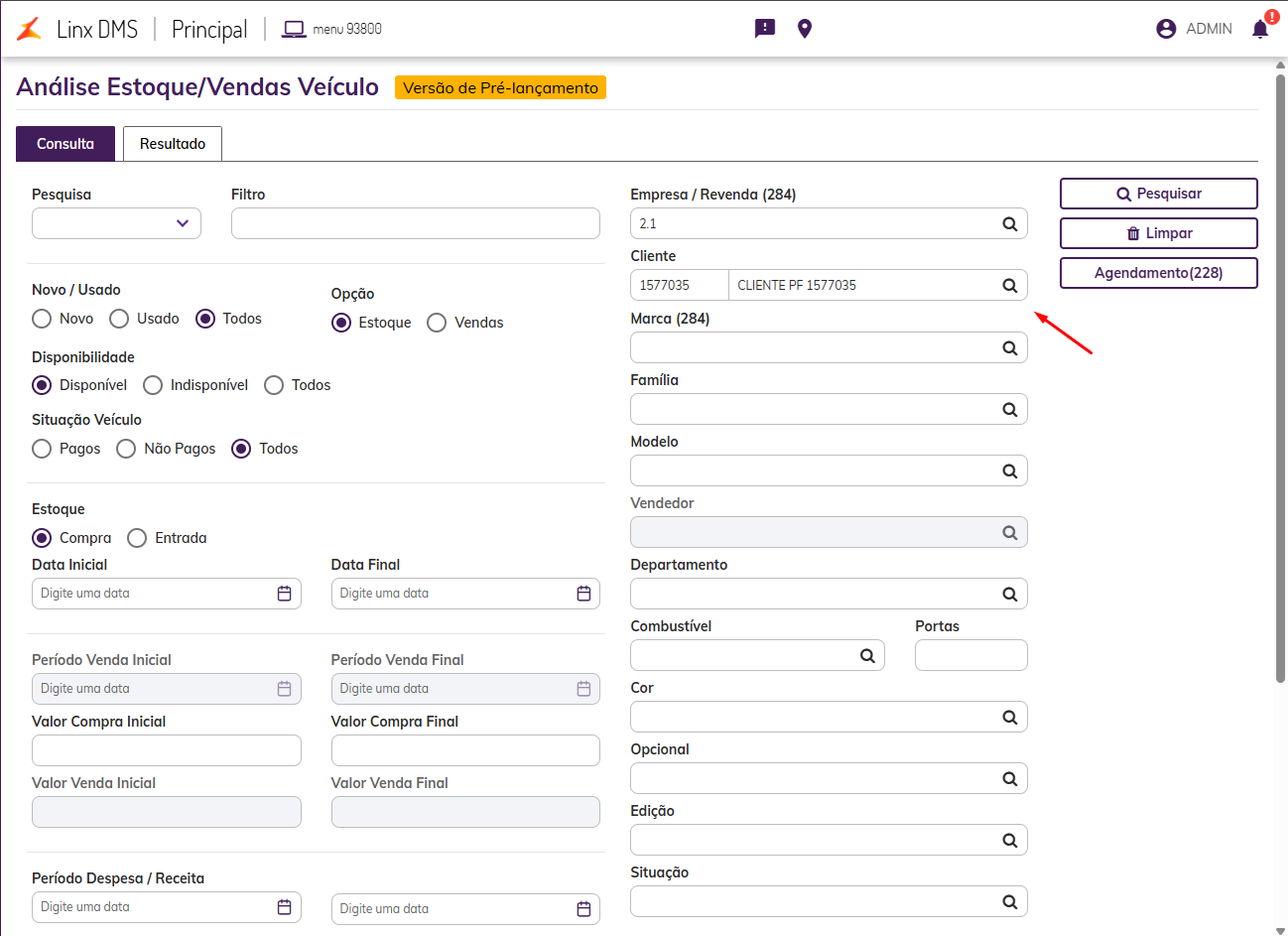 Descrição: Foi implementada uma melhoria no relatório Análise Estoque/Vendas, acessível pelo menu Veículos > Consultas/Relatórios, com o objetivo de aprimorar a análise de dados por cliente e aumentar a rastreabilidade das informações de vendas.