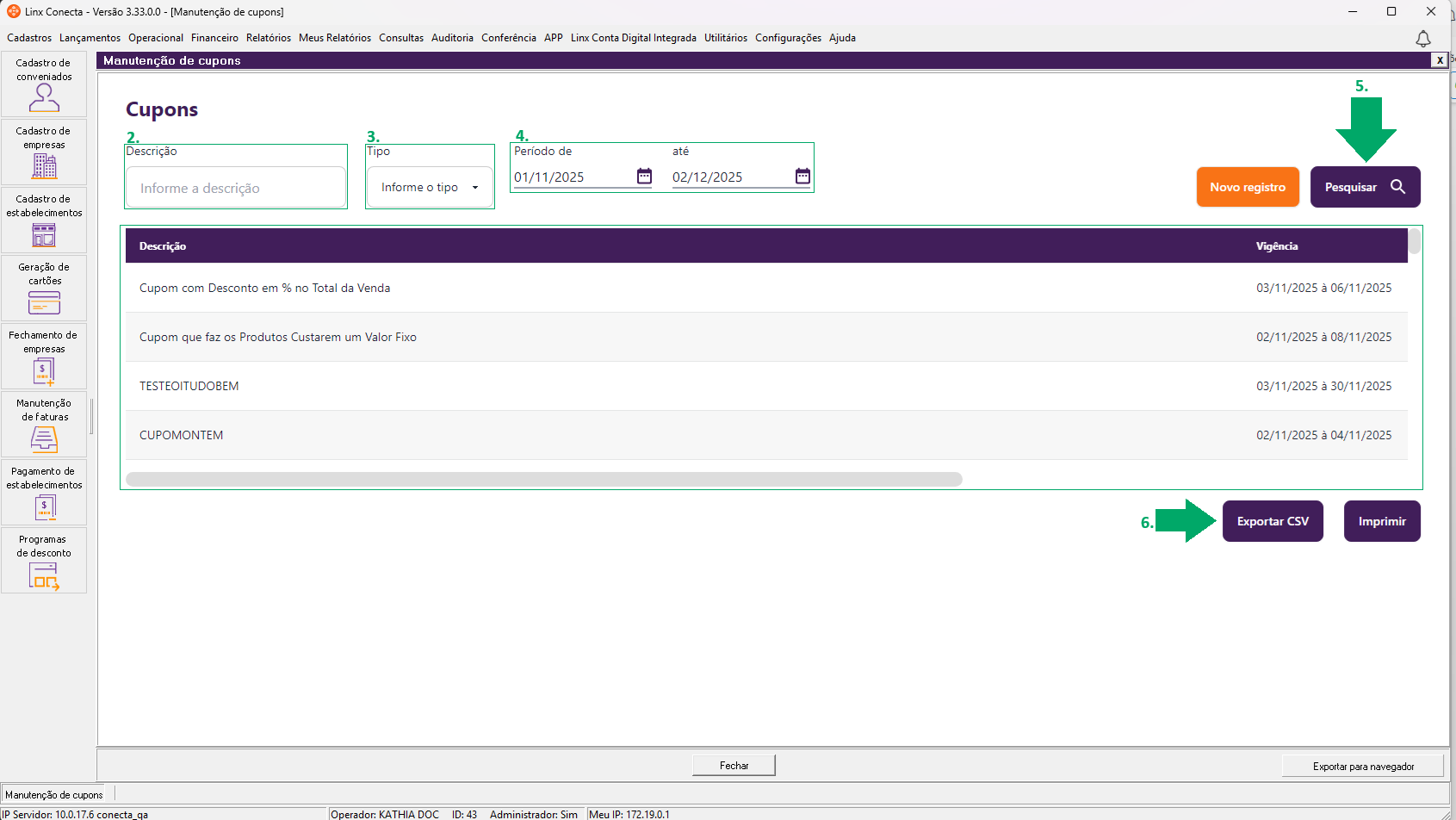 Como exportar CSV dos cupons promocionais, no módulo Conecta?