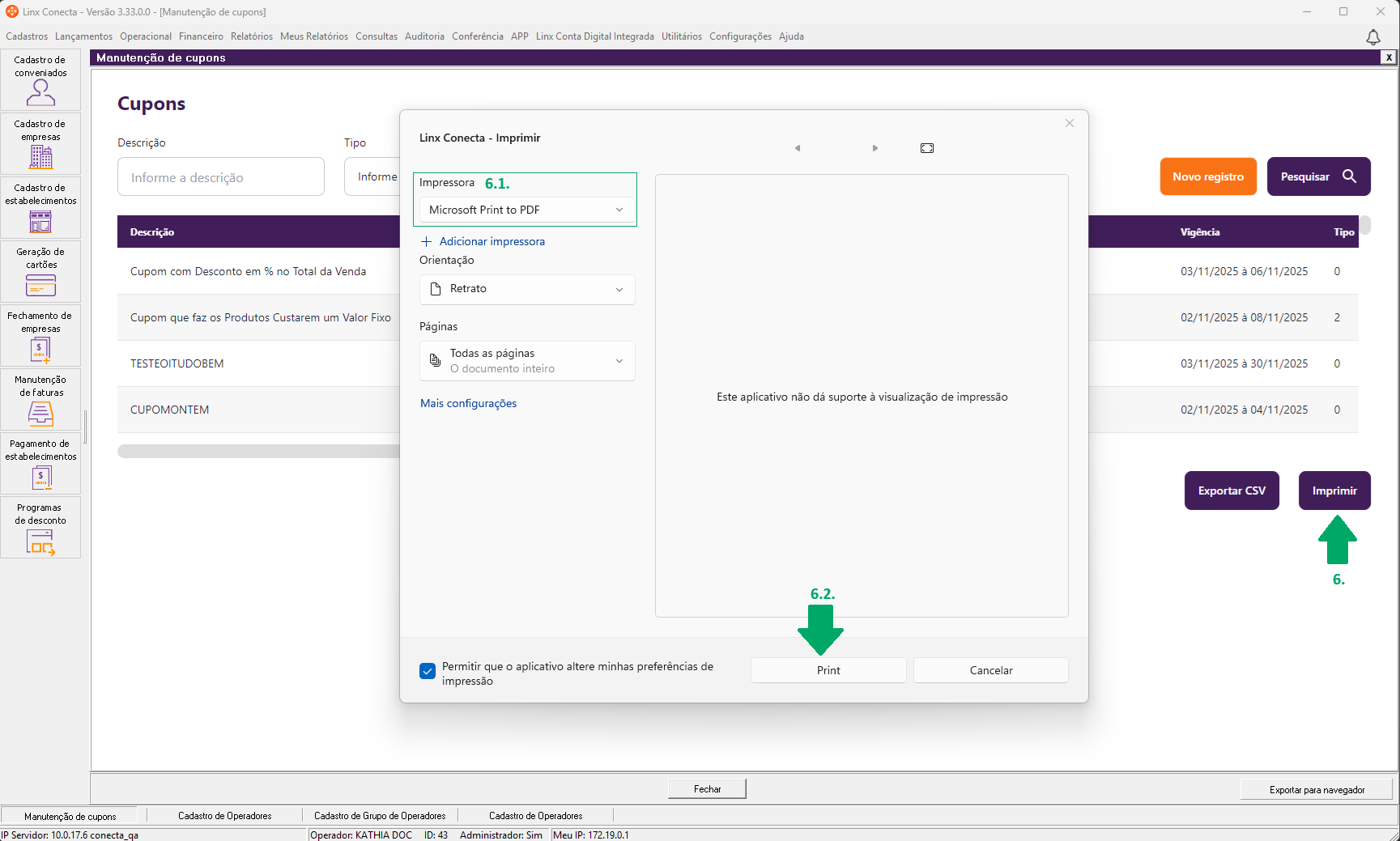 6.3. E será impresso ou salvo em PDF o arquivo com as informações do operador e dos cupons de 'Descrição', 'Vigência', 'Tipo', 'Título' e 'Situação'.