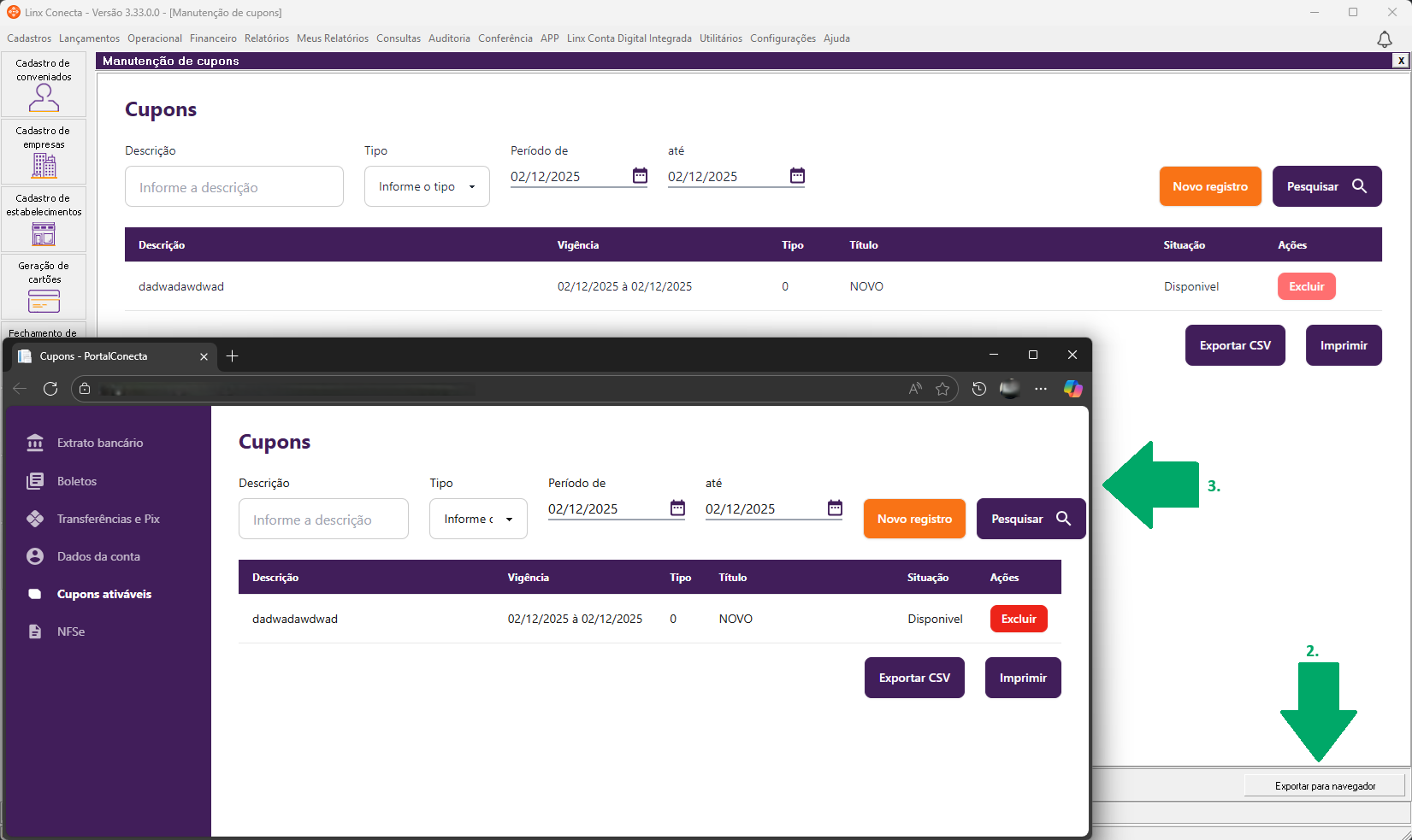 Linx Conecta - Manutenção de cupons - Como exportar CSV dos cupons promocionais