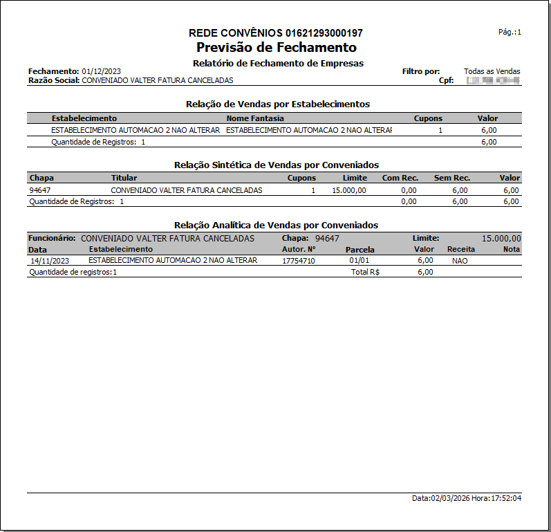 3. No filtro 'Data do fechamento', no campo 'Conveniado com fechamento' selecione a data de fechamento;