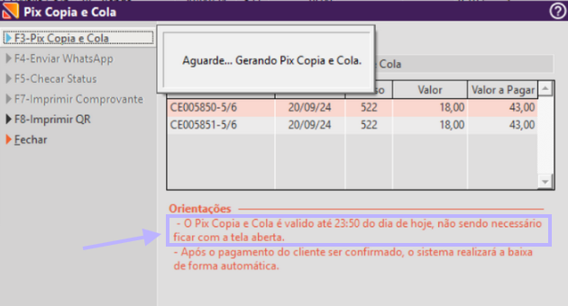 “O Pix Copia e Cola é válido até 23:50 do dia de hoje, não sendo necessário manter a tela aberta.”