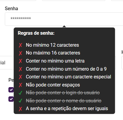 - Horário de Trabalho: define o período de horário que o usuário poderá acessar o sistema;