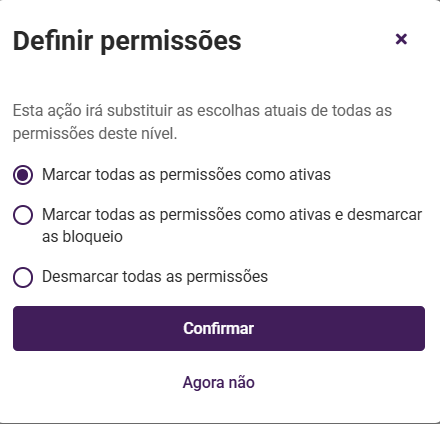 A opção "Desmarcar todas as permissões" só será apresentada se ao menos uma permissão do nível selecionado estiver ativa.
