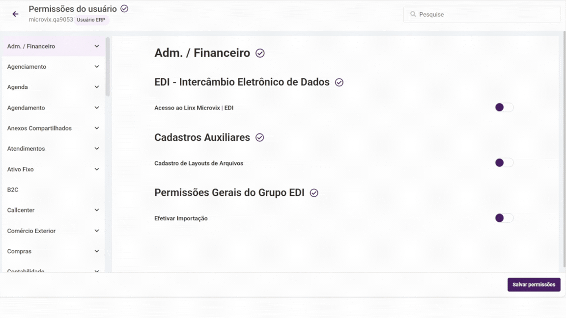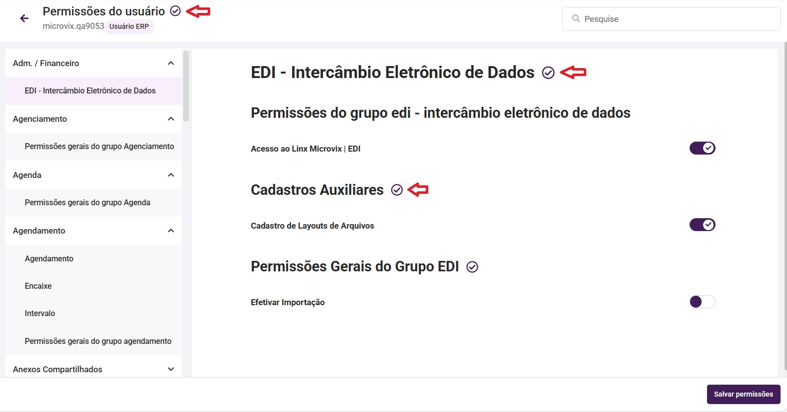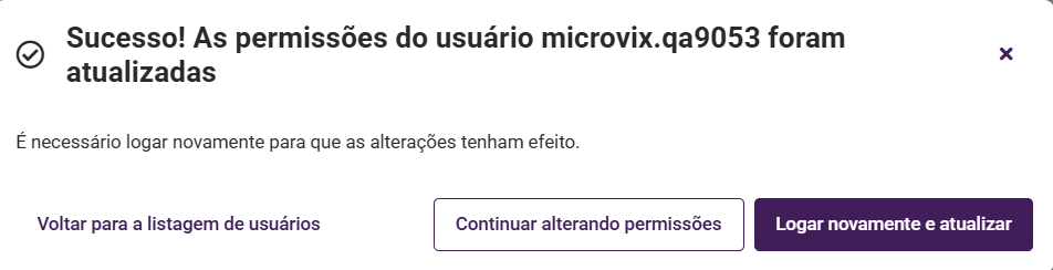 Depois que todas as permissões forem definidas, clique em "Salvar permissões" para finalizar. O sistema irá sinalizar o sucesso da operação com a mensagem: