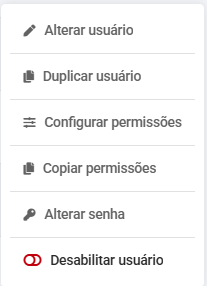 Ao retornar para a tela inicial, clique sobre os três pontos presentes na coluna "Ações" para ter acesso ao menu de opções do usuário. Através dele será possível alterar, duplicar ou desabilitar/habilitar o usuário escolhido, configurar ou copiar as permissões de outros usuários da listagem e alterar a senha atual.