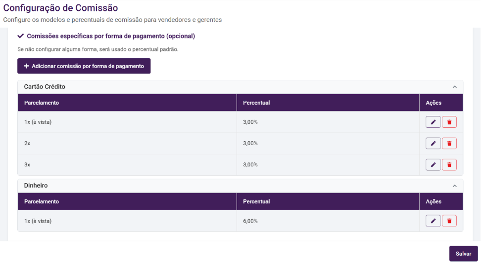 Além dos percentuais padrão, é possível definir percentuais específicos de comissão por forma de pagamento e quantidade de parcelas. Isso permite que a empresa pague comissões diferenciadas dependendo de como o cliente realizou o pagamento.