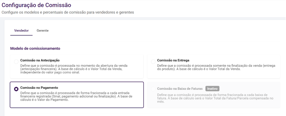 - Selecionar um único modelo de apuração de comissão por cargo (Vendedor e Gerente), entre quatro opções: Antecipação, Entrega, Pagamento ou Baixa de Faturas.