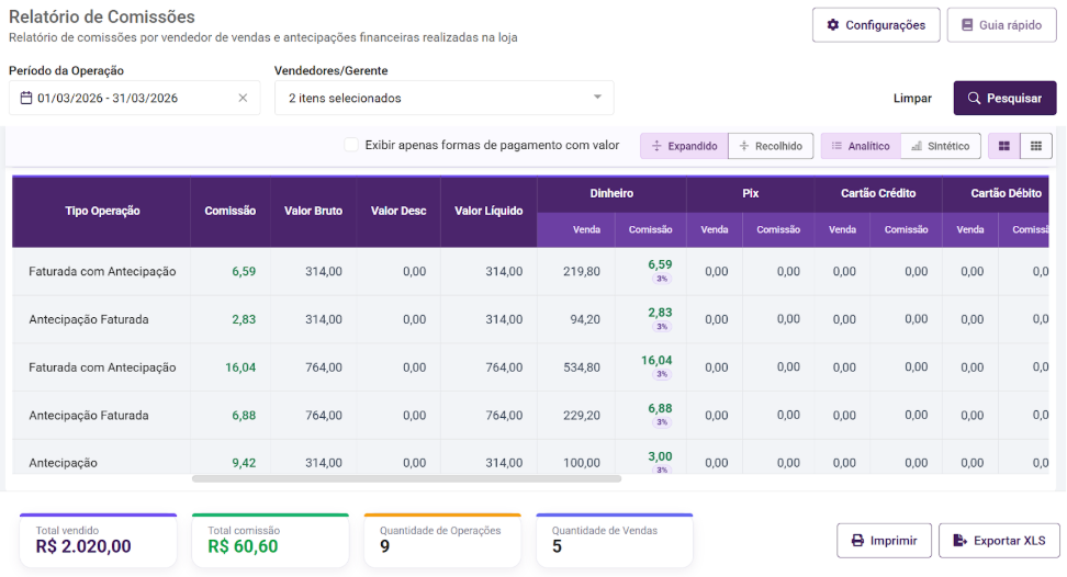 A visualização Analítica exibe cada operação e lançamento individualmente, sendo ideal para conferência da origem da comissão. O resultado é agrupado por Vendedor/Gerente.
