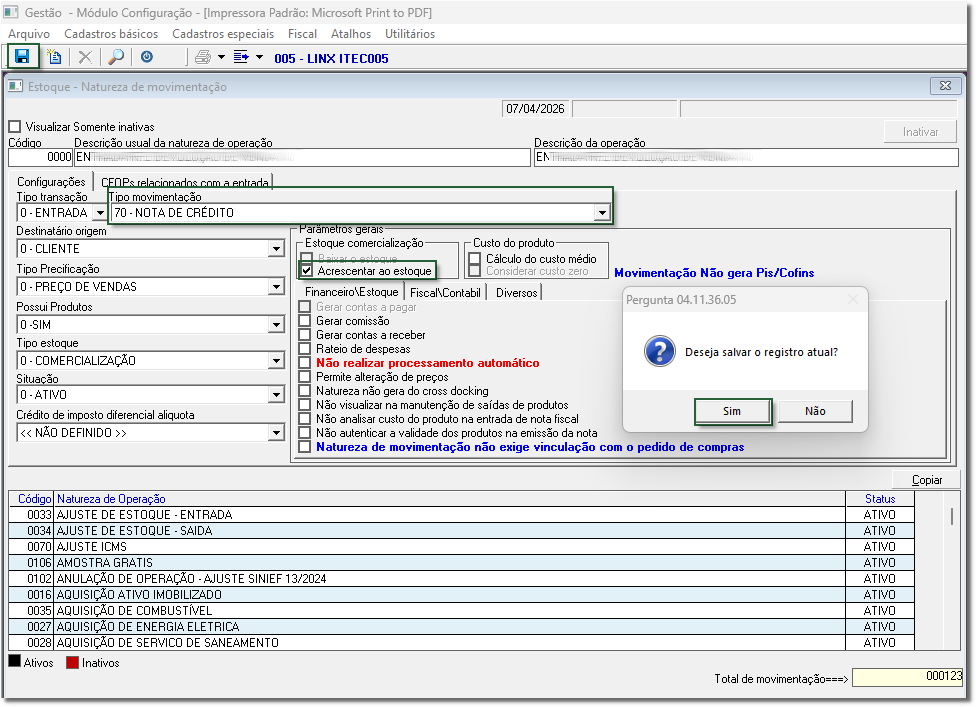 3. Acesse 'Como cadastrar movimentação de produto' para realizar o cadastro da Natureza de Operação, o mesmo deverá ser realizado com o tipo de movimentação '70 - NOTA DE CRÉDITO';