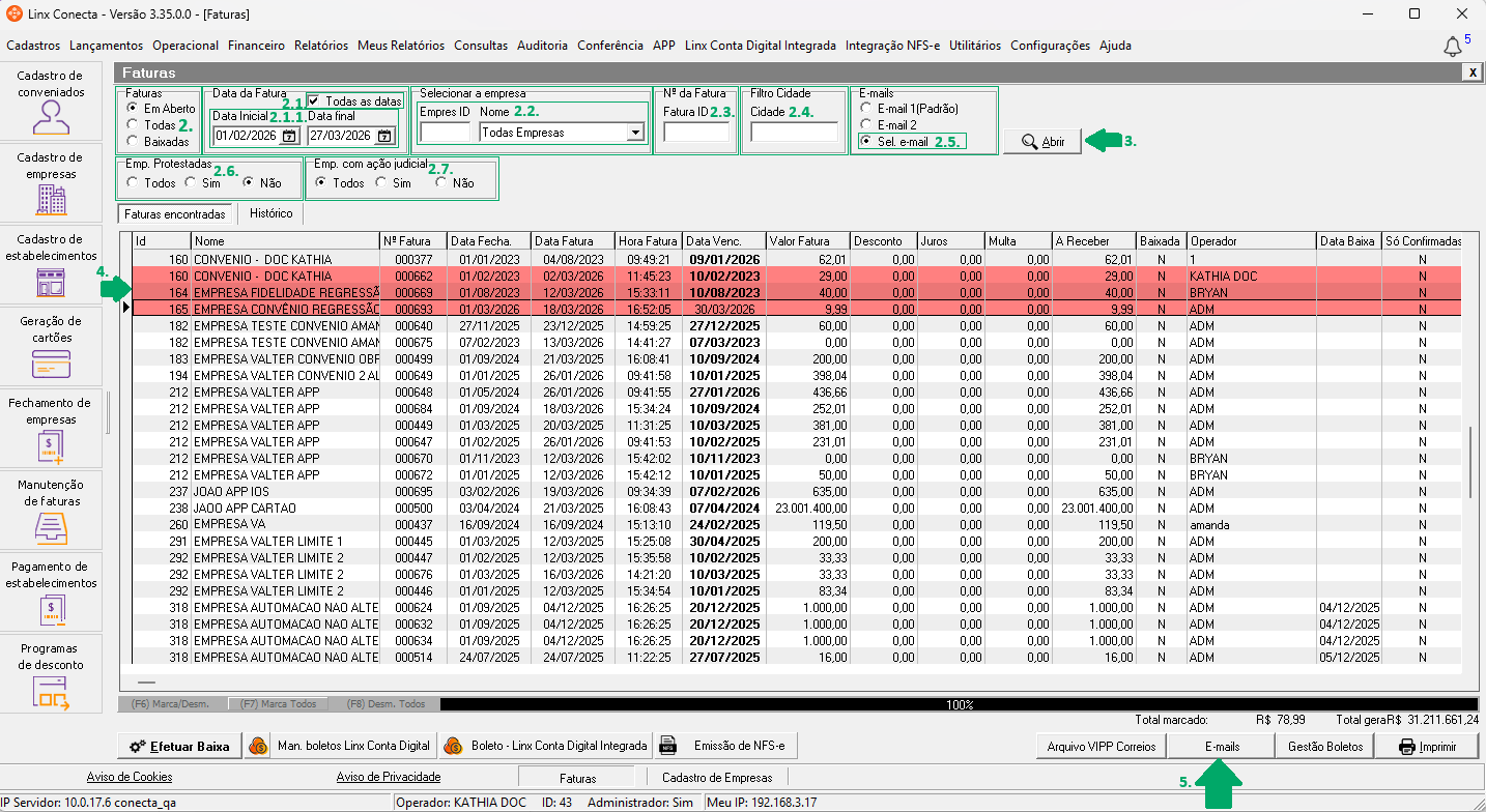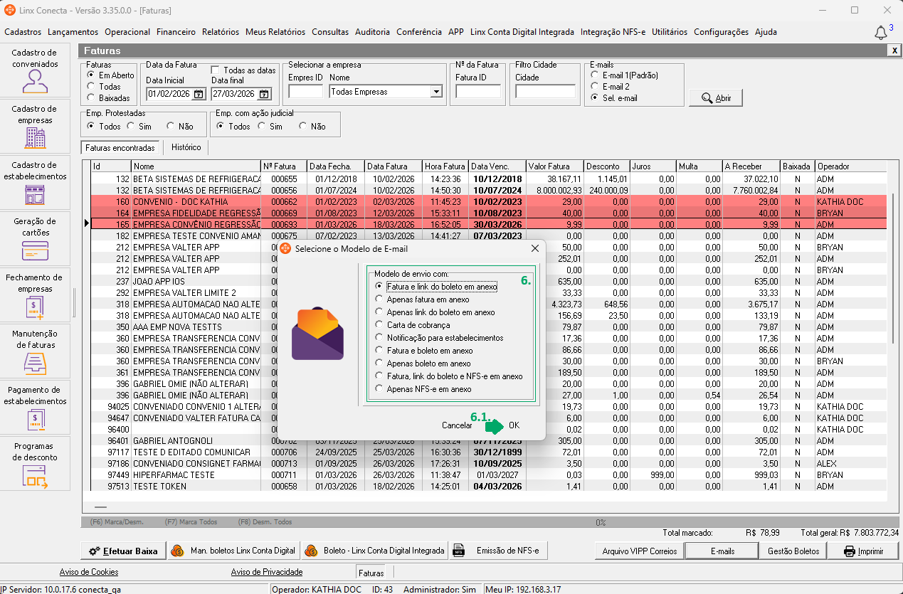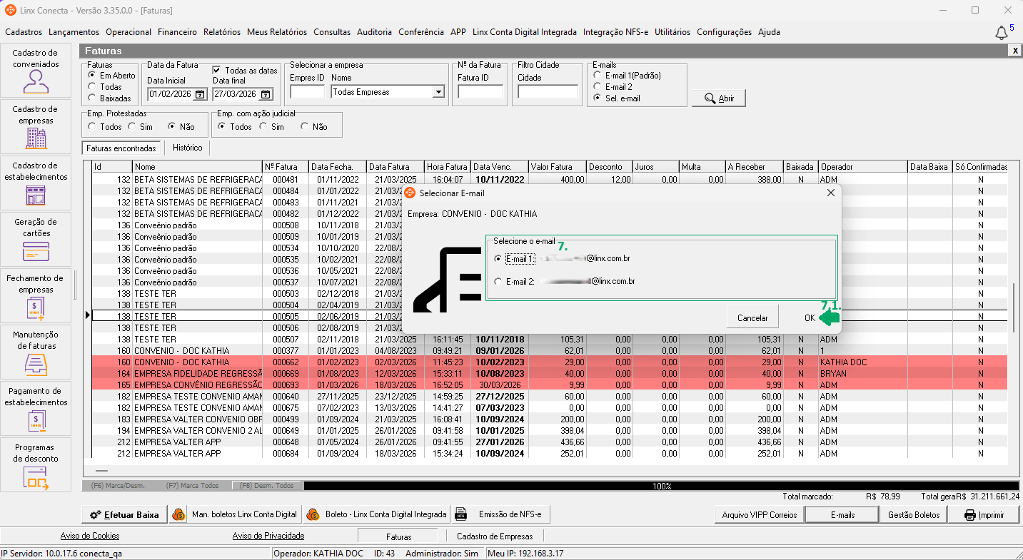 Como fazer o envio por e-mail, selecionando o endereço de e-mail de cada empresa, no módulo Conecta?