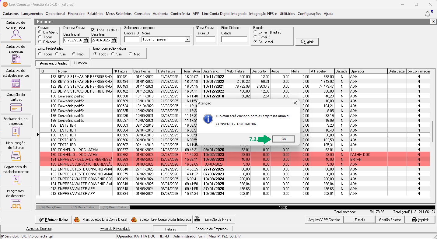7.2. Será exibida a mensagem: 'Atenção. O e-mail será enviado para as empresas abaixo: NOME DAS EMPRESAS'. Clique em 'OK'.