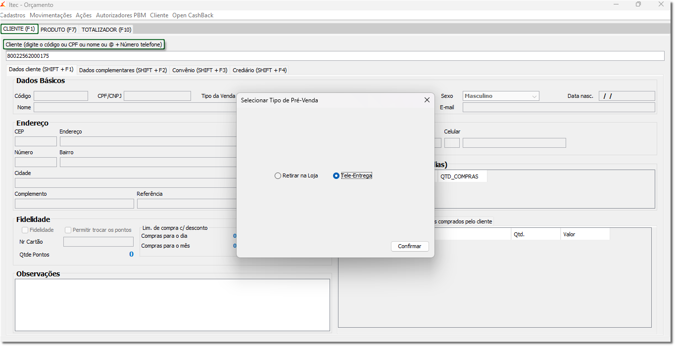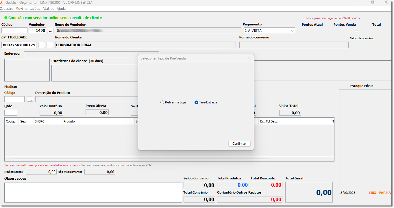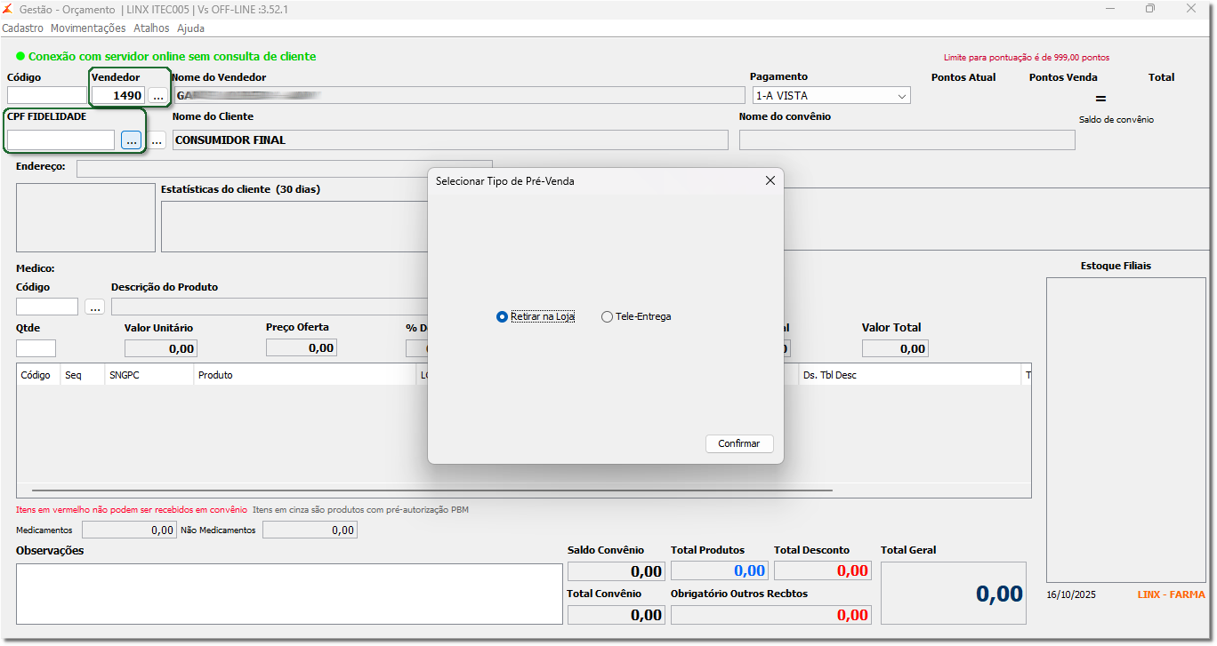 Linx Itec - Orçamento 4.0 - Como selecionar o tipo de venda entre retirar na loja ou tele-entrega quando o cliente for pessoa jurídica (CNPJ)