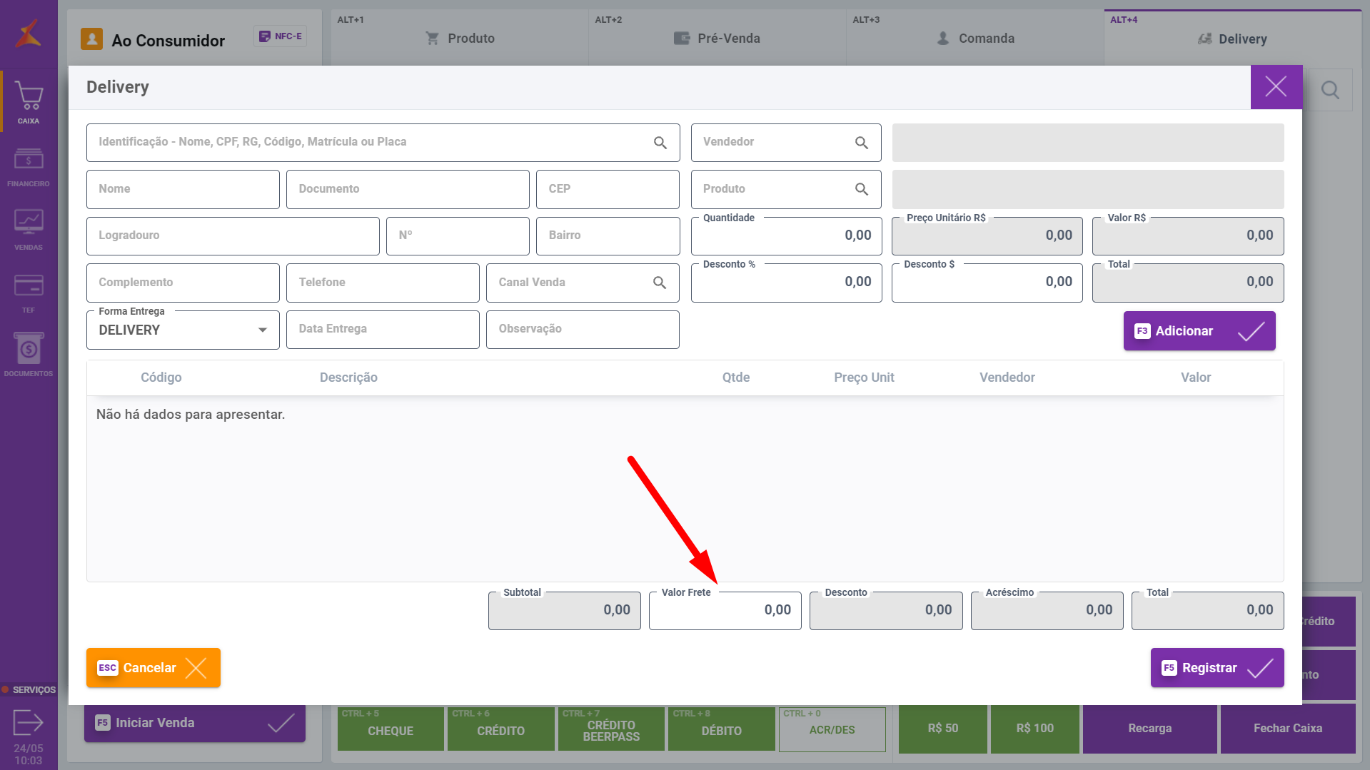 Evidência 2 (Alerta quando informa valor de frete sem informar cliente).png