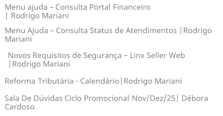 Arquivo PDF Webinar JUL 2025 - Lançamento e Emissão NF-e no Linx Seller Web.pdf 1.64 MB Jeniffer de Matos Soares out 30, 2025 10:52