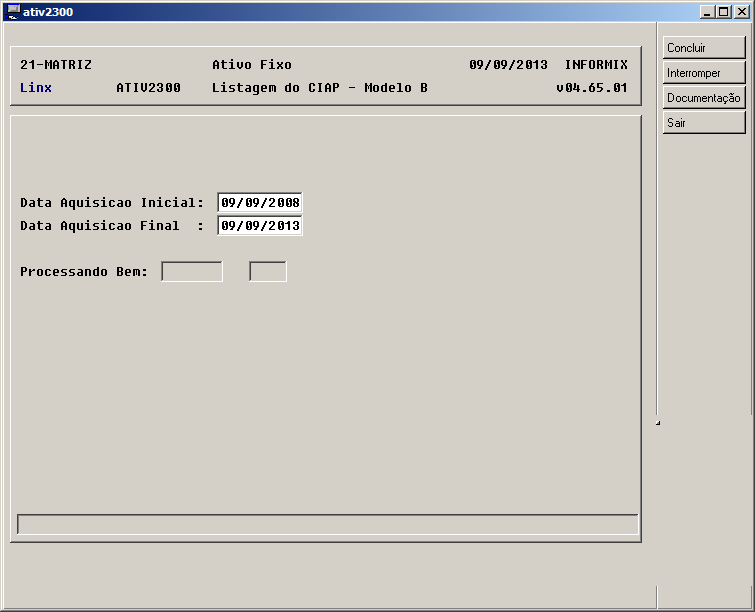 Opções do programa Como critério para a geração do relatório será solicitado o intervalo de datas desejado (Data de Aquisição Inicial e Final):