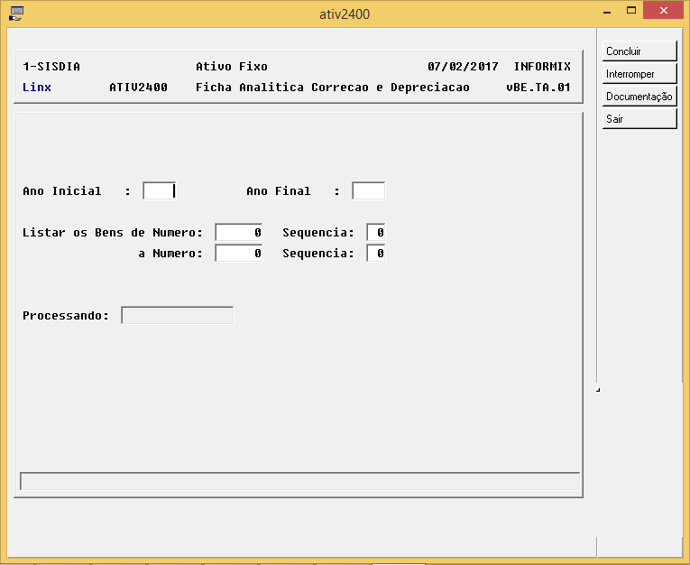 Opções do programa Mostra todos os dados do bem (fornecedor, data de aquisição, data da baixa, etc) e também os valores acumulados de depreciação. Solicita os seguintes dados: ano base e o número e a sequência dos bens De/Até.