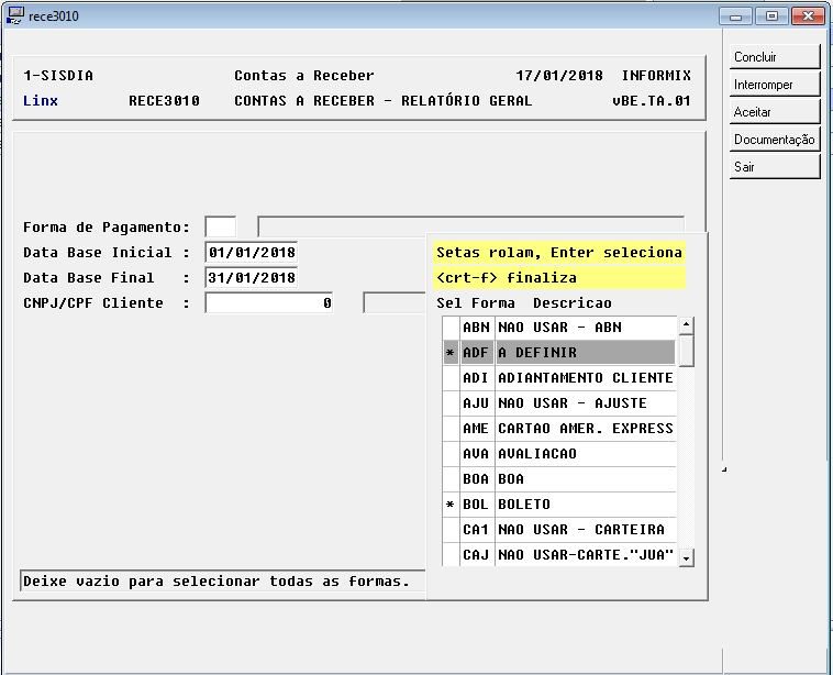 usando o botão <ENTER>, para cada forma desejada. Para todas as formas, basta deixar o campo "Forma de Pagamento" da tela em branco e, para usar apenas uma, pode-se digitar diretamente no campo, ou usar a tela de ajuda.