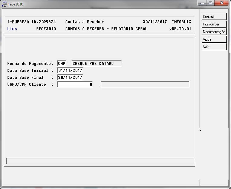 O objetivo deste programa é emitir um relatório com informações sobre contas a receber (RECE3000), veículos faturados (VEIC4340) e cheques (RECE6210) tudo em um só lugar, com base em um período de data definido na tela do programa, campo "Data Base Inicial" e "Data Base Final".
