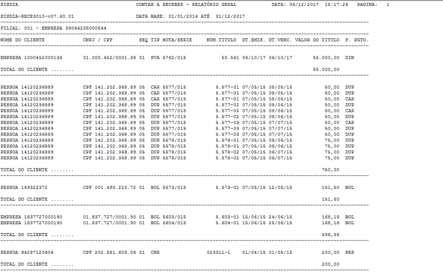 - CNPJ/CPF Cliente: CNPJ ou CPF do cliente e/ou responsável pelo lançamento/título.
