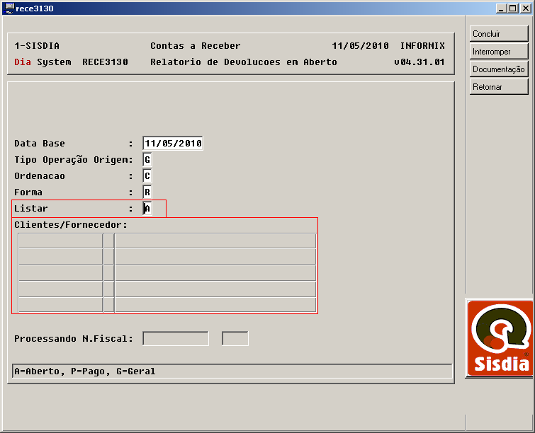Aberto – lista devoluções em Aberto (quando a data que foi efetuada a baixa é menor ou igual à data preenchida).
