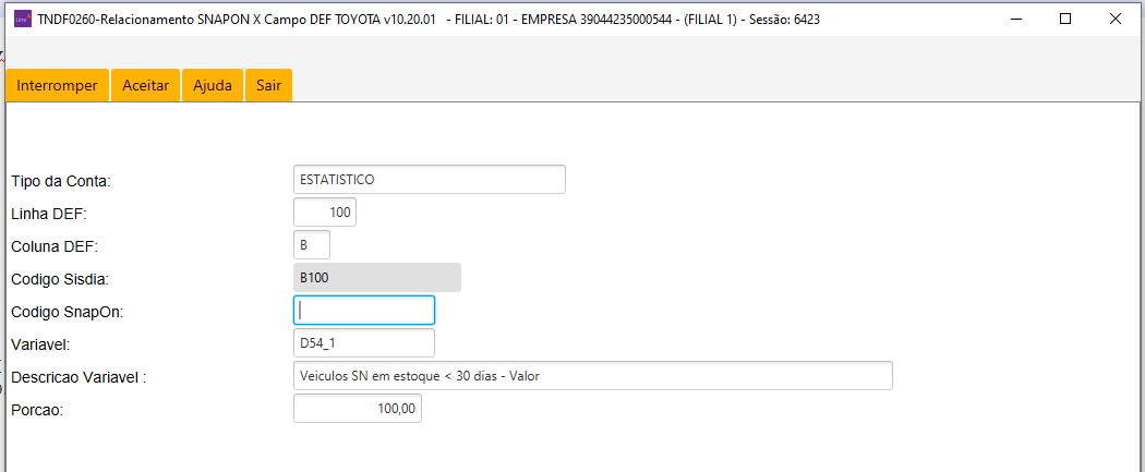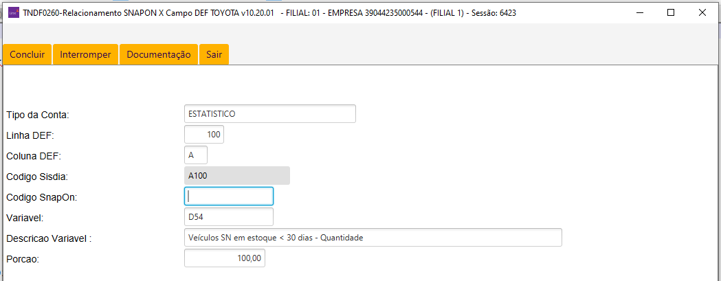 Pre-Requisito : Deverá ser feita a correlação dos campos D54 a D60 do Código Sisdia (linha/coluna) com o Código SnapOn, no programa TNDF0260, conforme exemplo abaixo: