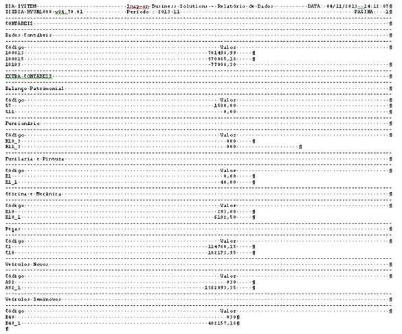 Este arquivo irá auxiliar a concessionária durante o processo de seu mapeamento de contas do DMS para os campos específicos do Fabricante, no formulário que será submetido à apresentação. Ambos os arquivos conterão todos os dados financeiros e estatísticos necessários no formulário de apresentação, Contas Contábeis e Extras Contábeis. Informações Contábeis: Serão geradas somente as contas contábeis analíticas do plano de contas da empresa CADA0260, que tiveram movimentações no período. Será gravado no arquivo apenas o código e a descrição da conta. A formatação do campo "Casa Input" do SnapOnn quando de origem contábil e utilizando Centro de Custo (CADA0260 – campo "Pede Centro Custo" = "S"), passa a ser da seguinte forma: Exemplo: "111201_IIDDSS", onde '111201' é a conta contábil CADA0260 e 'II' a Divisão CADP0170, 'DD' o Departamento CADA0280 e 'SS' o Setor CADA0305. Informações Extras Contábeis: Será utilizada a mesma fórmula e regra de cálculo do processo do DEF (tabela "tndfmovi"). - Nome do Arquivo Dados: Nome do arquivo dados que deve ter a seguinte nomenclatura "dados_aaaa_dd.txt", onde aaaa = ano e dd = mês.