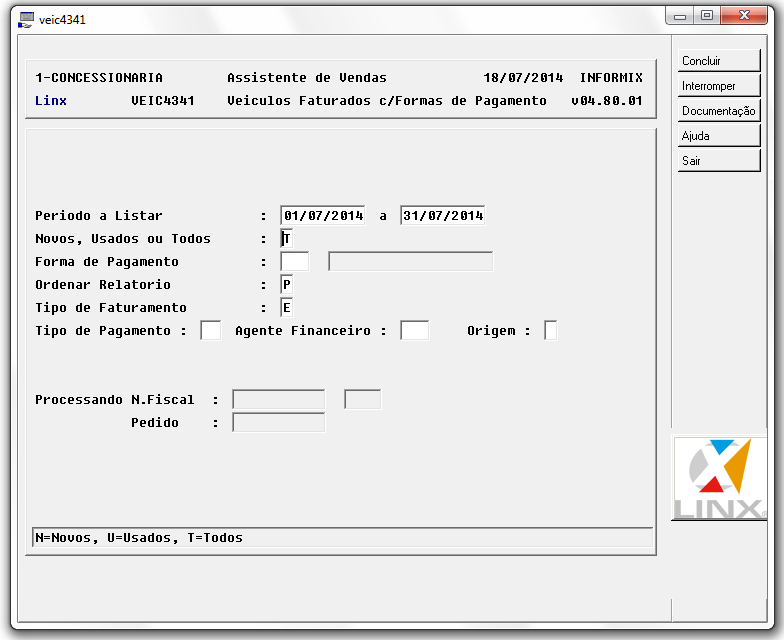 - Tipo de Pagamento: Tipo de pagamento conforme o programa CADA0140 e parametrizado no programa VEIC0070.