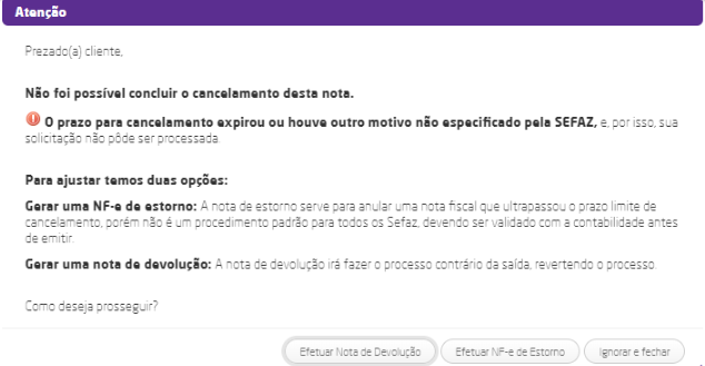 Se o tempo determinado pela SEFAZ para o cancelamento de nota fiscal autorizada já tiver expirado, ao tentar realizar o cancelamento o sistema informará ao usuário que o tempo expirou e que ele poderá realizar a emissão de uma nota de estorno.