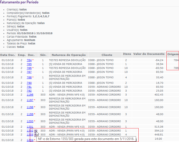 Nos relatórios Movimento Diário e Faturamento por Período, a nota fiscal que foi estornada deverá ser apresentada como um informativo. E no relatório Faturamento por Período, para as NF-es de Estorno, na coluna "Origem", apresentará o número da nota estonada.