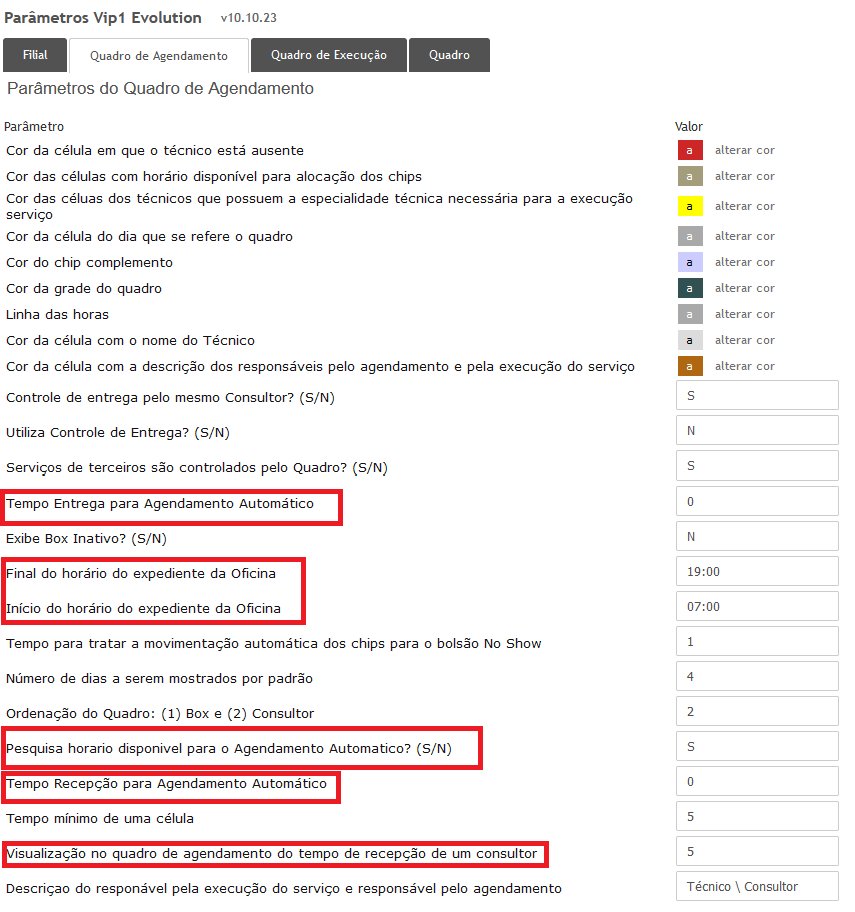 - A origem da início e fim de expediente e o tempo padrão do intervalo a ser utilizado no serviço listaHorariosVagos é parametrizado a partir do VIPE1001, aba Quadro agendamento, conforme exemplo abaixo:
