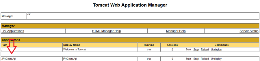 - Alternativamente é possível efetuar o deploy do FlyChatsApi.war pela interface gráfica do Apache Tomcat