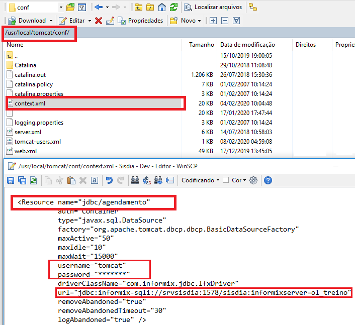 - Configurar o arquivo context.xml em /usr/local/tomcat/conf, criando a instancia 'agendamento' no qual será realizado a conexão com o banco de dados Informix;