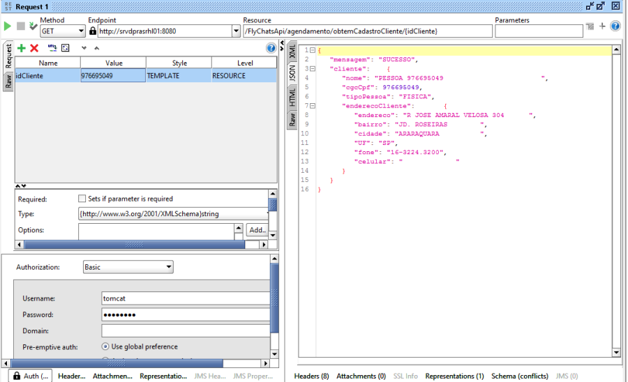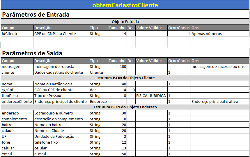 b) ObtemCadastroCliente: o FlyChats passa o CPF/CNPJ do cliente e a API retorna os dados cadastrais do cliente.
