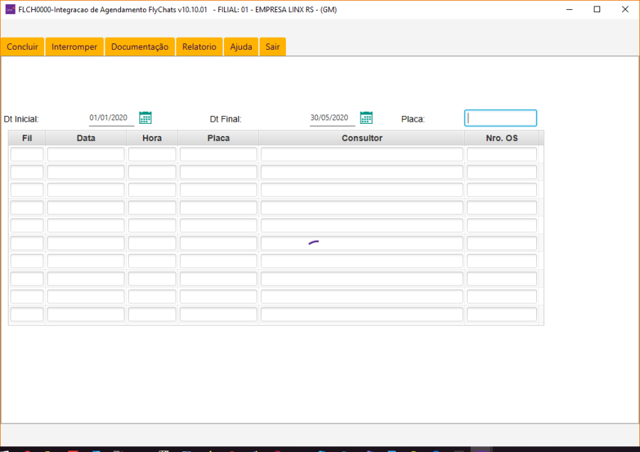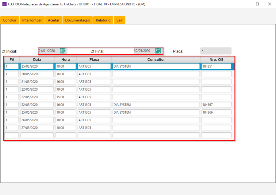 Para este caso, o filtro corresponde ao dia 01/01/2020 até 30/05/2020, retornando todas as pré-ordens abertas pelo FlyChats e na última coluna "Nro. OS" são exibidas as Ordens de Serviços geradas: