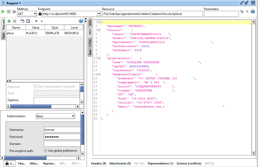 c) ObtemCadastroVeículo: o FlyChats passa a placa do veículo e a API retorna os dados cadastrais do veículo.