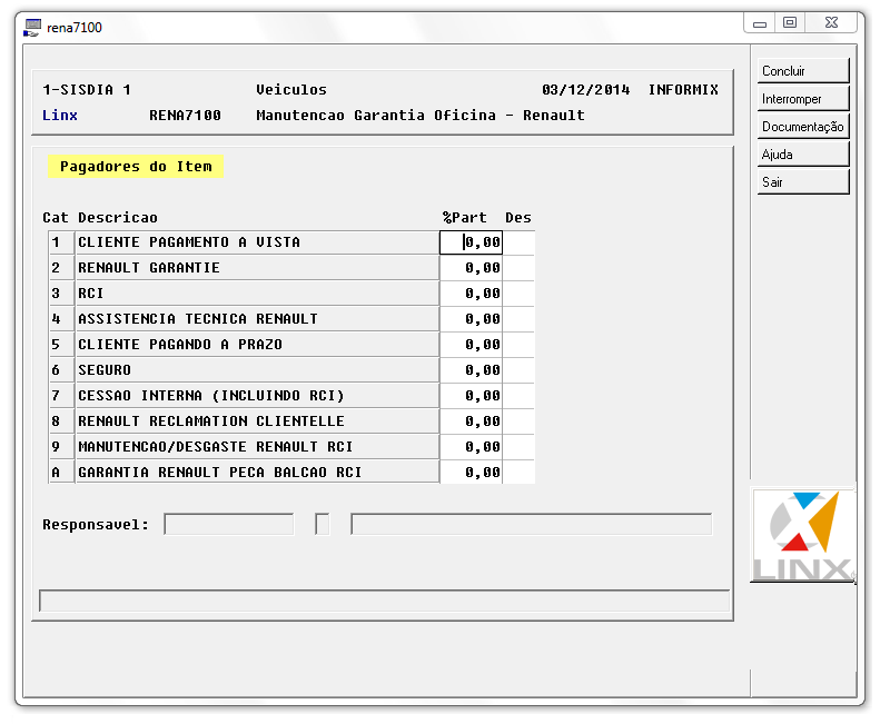 Para cada categoria (que representa o responsável pelo pagamento da intervenção da OS, definidas pela Renault), deverá ser informado seu respectivo tipo de ordem de serviço. Essa informação será utilizada pelo programa RENA3501 para realizar o rateio dos percentuais definidos para cada pagador.