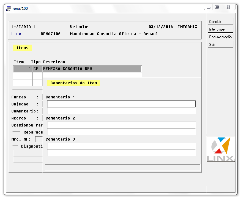 - Na opção F4 – Itens: Deverão ser preenchidos os seguintes campos: função, reclamação, comentário do cliente, se o defeito ocasionou a parada do veículo, se é uma solicitação de cliente e o número do acordo (se houver). Há funções de ajuda (<CTRL+E>) para o campo reclamação do cliente. Dentro desta opção existem também outras informações para serem definidas, como o defeito (peça ou mão de obra causadora, caso não tenha sido informado através dos programas (OFIC1400) ou (OFIC2005), dados da reparação (se houver) e os pagadores da intervenção. Essa última é de extrema importância para todo o processo de garantia. Dentro dela deverá ser definido também o código de despesa (para este campo existe a função de ajuda (<CTRL+E>)).
